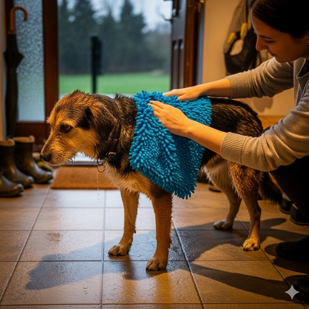 Wenn dein Hund aus der Dusche, dem Regen oder einer Pfütze kommt, musst du ihn nicht mehr mit schweren, nassen Handtüchern trocken rubbeln. Dieses Mikrofaser-Handtuch nimmt Wasser sofort auf, zieht Schmutz und Feuchtigkeit regelrecht aus Fell und Haut. Dein Hund fühlt sich trocken und angenehm — weniger kaltes Fell, weniger Gefahr für Erkältung oder unangenehmes Frieren. Für dich bedeutet es: weniger Pfützen auf dem Boden, weniger Aufwischen, und deutlich weniger Zeitaufwand. Besonders praktisch nach Spaziergängen im Regen oder beim Autofahren: Die Reise bleibt sauber.